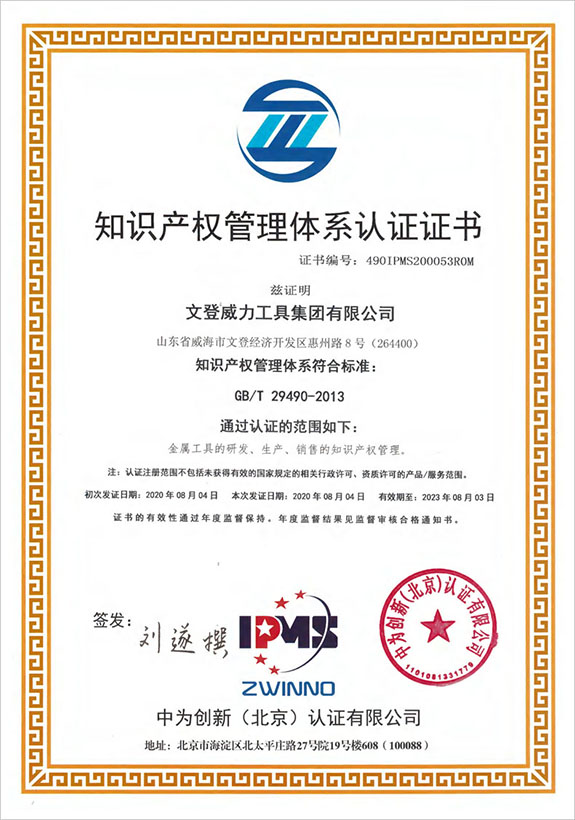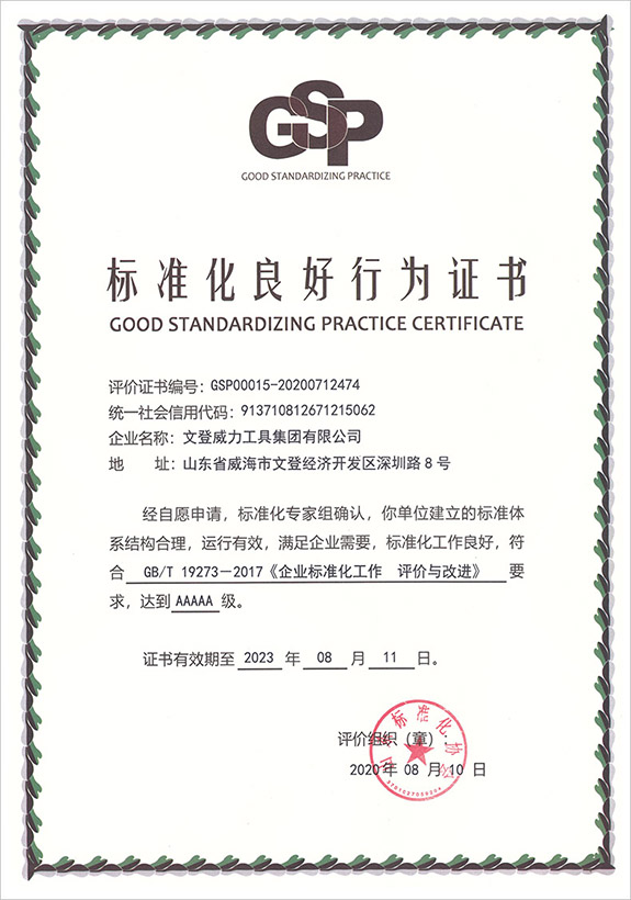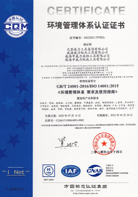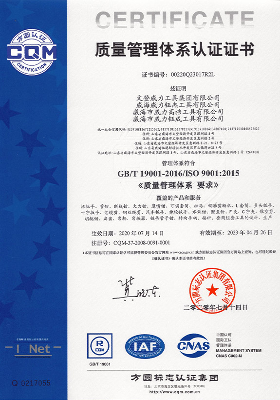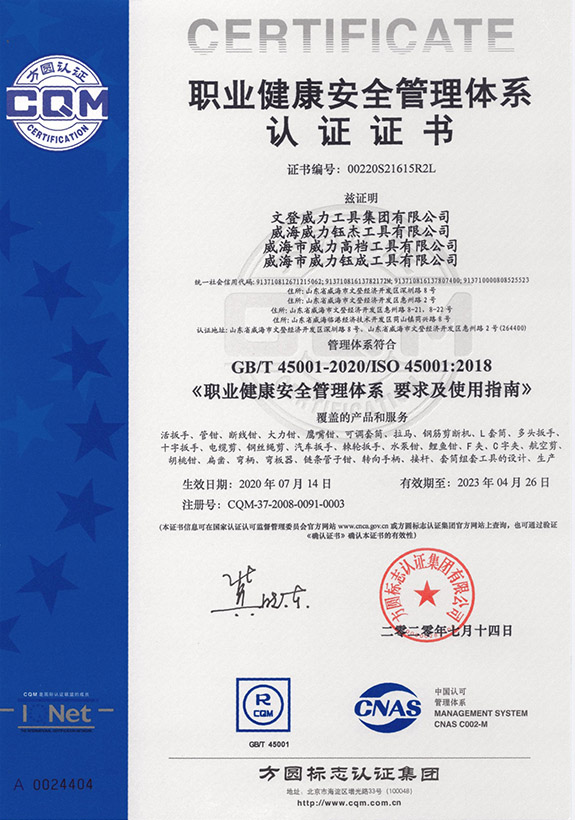1996年,威力集團率先在五金制品行業(yè)通過了ISO9001質(zhì)量體系認系,隨后又相繼通過了OHSAS18001職業(yè)健康認證、ISO14001環(huán)境體系認證、韓國KS、日本JIS、德國VPA/GS認證。
